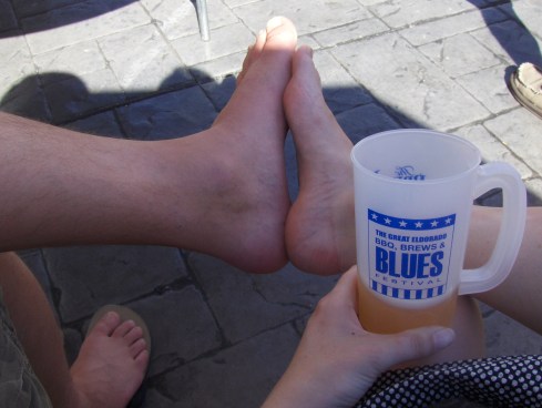 Travis and I went to the Eldorado’s BBQ, Blues, and Brews festival in downtown Reno. It felt like summer with the heat, the cold beer, and the hundreds of drunk Renoites. We both foolishly wore new shoes, and our dogs were barking quickly. We were lucky to find two spare chairs near the stage in the shade where we rested our feet, took turns fetching more beer, and listened to the blues music. The people watching was also in top condition. The best and the worst of our Reno were out in full force. Always entertaining.