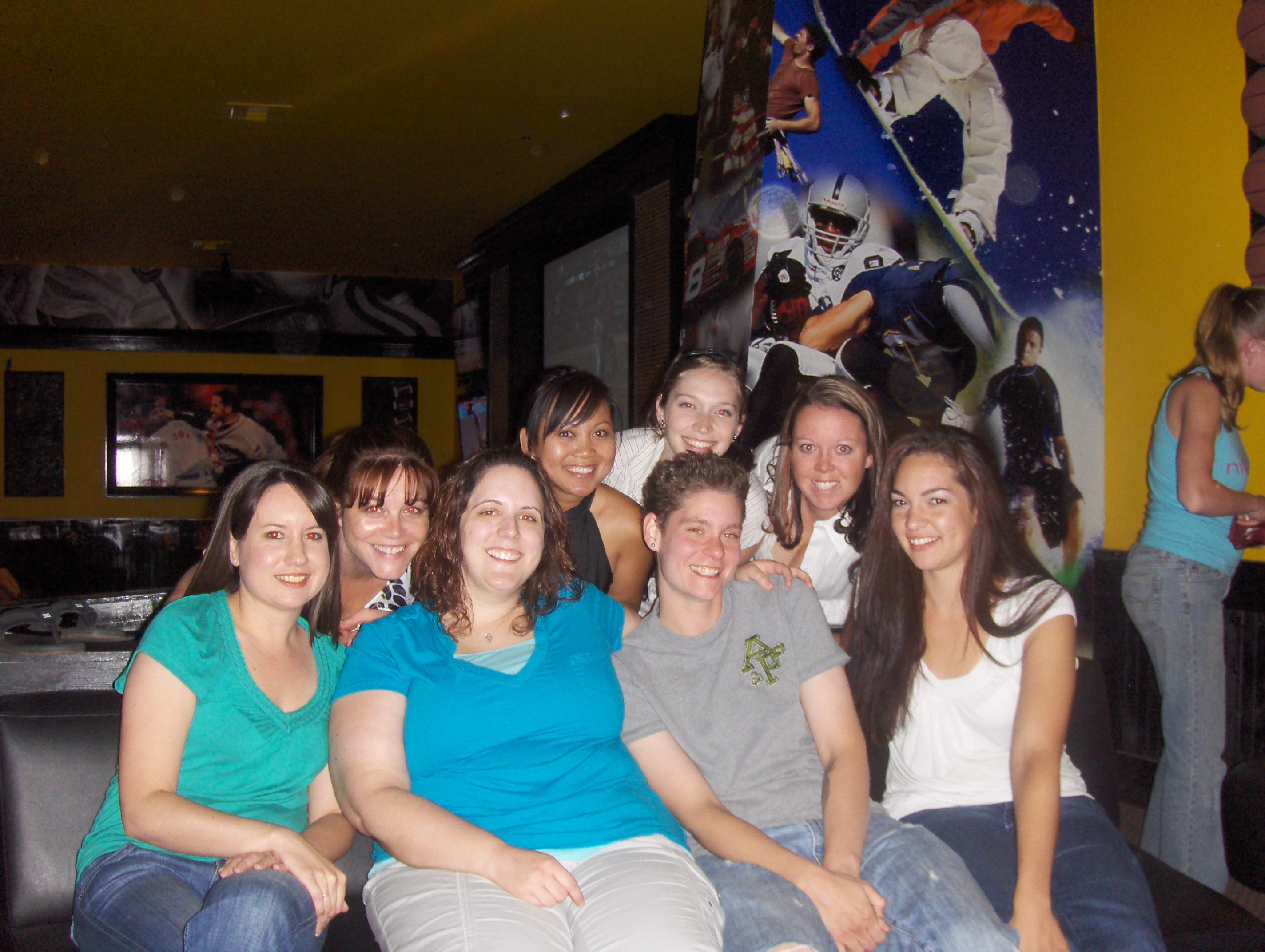 My co-workers and I all went out to Rack ‘N’ Pins, a bowling/pool place. We were celebrating and mourning the complete destruction of our department. While most departments in the hospital are being either eliminated or altered significantly, ours is a combination of a lot of factors. Our pre-admit staff is being replaced by nurses. Our manager was transferred to the ER. Our lead got a much-deserved promotion. Three other registration girls found jobs elsewhere. I put in my notice that I am moving to New York City. Essentially only four of my co-workers will still be in that department. This is not the whole group, and I look like a goober, but it’s the only picture of the “Roseview Wreckers” I have so it will have to do.