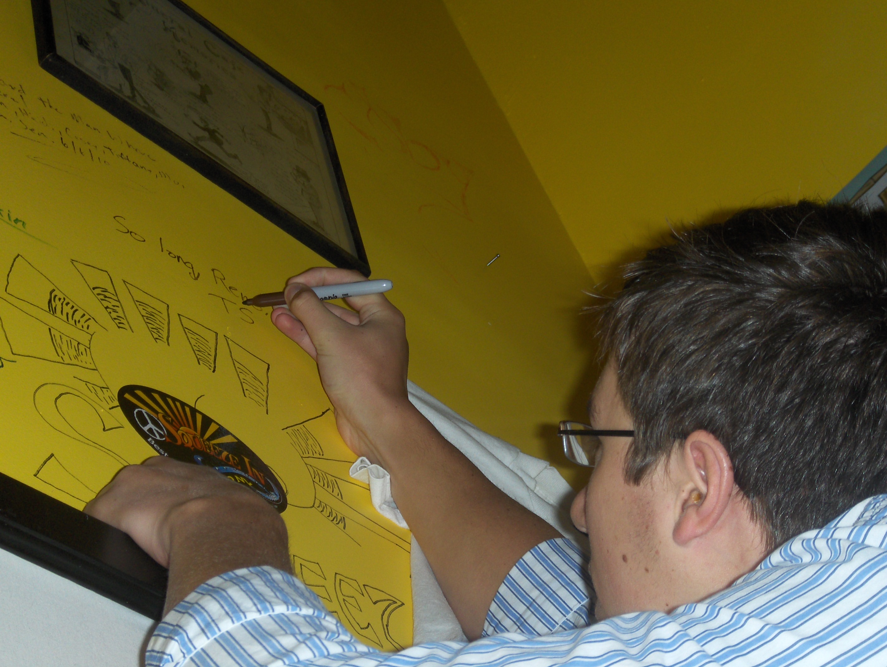 Saturday morning, we met some of Travis’ friends at Squeeze In for breakfast. For those that haven’t visited this beloved Reno/Truckee establishment, the walls are covered with messages, drawings, etc. As we sipped our coffee and waited for our omelets, we saw a girl climb on her boy’s shoulders to make her mark on a high spot on the wall. Her butt was showing which is why we were all looking, but then we realized Travis had to make his mark. Especially since he is so tall, him standing on a chair puts him at a level of the restaurant that few people have been able to go before. So Long T$.