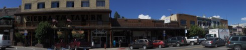 Sunday, I went up to Truckee, California to attend a Yoga/Mediation class. I drove up and down the streets completely unable to find the studio. It was getting to be 15 minutes or so past the time the class was supposed to start, and I was getting flustered and stressed which is entirely the opposite purpose of me wanting to take the class. I want to be calmer and have more control over my mind. I want to not worry so much. So I parked the car and forgot about the class. I’ll find some other one I told myself. So instead of meditation and stretching and calming, I got a Corona and some fantastic Mexican food, all greasy and spicy. Then I walked up and down the streets of Truckee. I love that town. I stick to it. I would live there if I ever got the chance. This is a panorama of the downtown area. It was bright out, and I accidentally misaligned the last frame. So it looks like the Sierra Ta Tavern. Whoops.