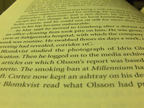 Obviously a very last minute photo. I was reading before going to bed and starting to get tired when I realized I needed a picture. Strangely last time I opted to take the easy road and just take a picture of whatever book I am reading, I was reading a book from this series. The Millenium series as it is known in Sweden. This book is the final book in the trilogy. For English readers, it is called “The Girl Who Kicked the Hornet’s Nest.” The Swedish title is “Exploding Castles in the Sky.” A little strange, but it fits with the theme of the novel. The true injustice to English readers is the first book. It is called “The Girl With the Dragon Tattoo,” but in Swedish it is called “Men Who Hate Women,” which is simply an awesome title. It is strongly what the entire series is about. Time and again in the books, women are subjected to horrible things at the hands of men who don’t consider them equals. Without giving too much away, the book doesn’t just indict specific men, it points out society’s willingness to ignore the plight of some women. But of course, the title sounds feminist, and Americans are afraid of feminism. The books do deal with feminism though, but in the context of an exciting thriller. Americans just have to be snuck feminist ideals, or they wouldn’t swallow it down. Also, I watched the Swedish film version of the book, it was really good! But of course, they are insisting on making an English version. I feel offended as an American that our culture is believed to be unable to handle anything that isn’t watered down or Americanized. But, of course, I also understand why this assumption is made.