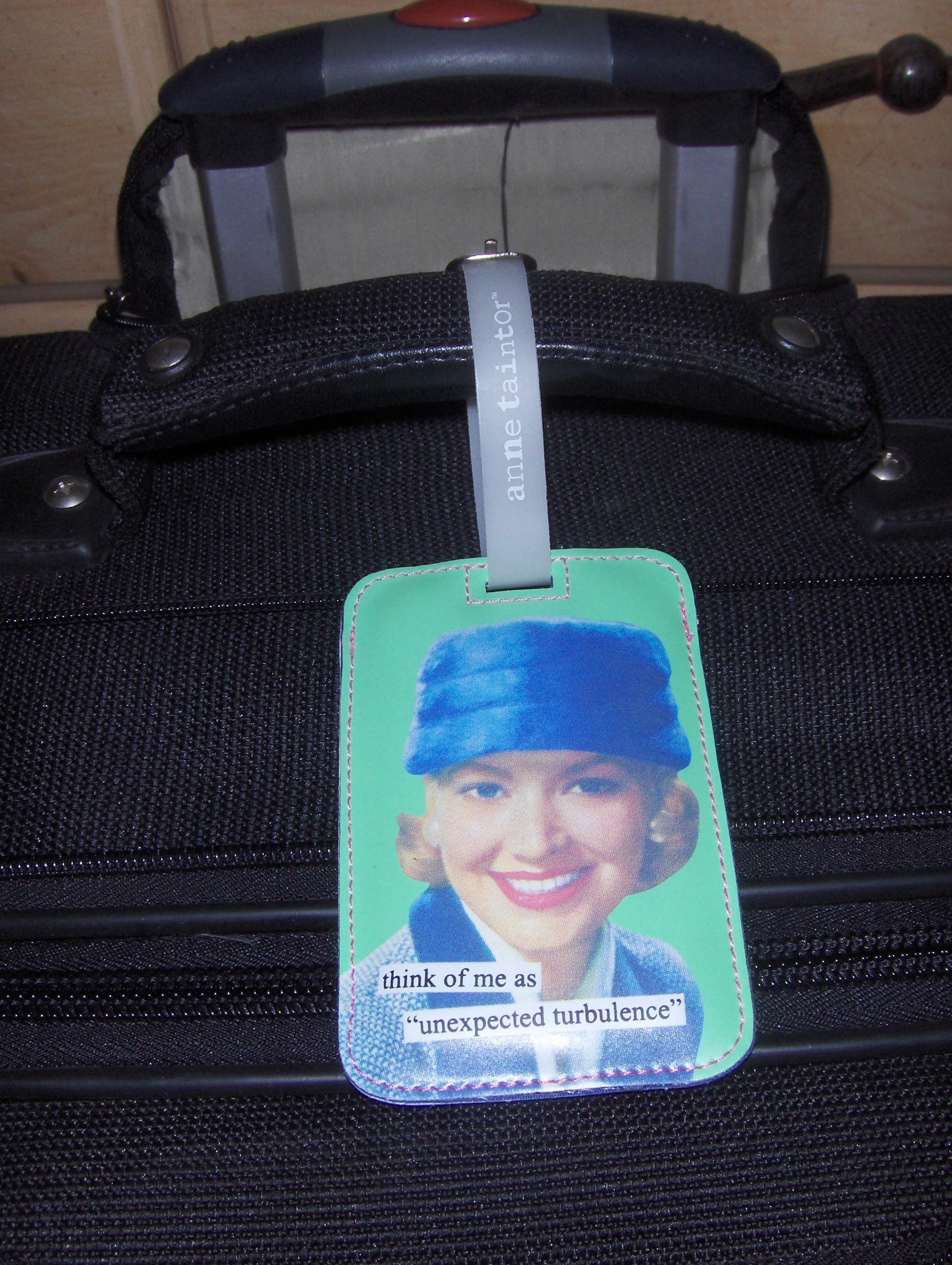 The day before I left, I spent most of the day doing laundry, packing, etc. I also went to a brunch where my parents got to meet Travis’s parents for the first time. It went very well, and everyone liked each other. As a going away present, Travis’s mom gave me the bag tag you see on my luggage. I’m just a sucker for retro things.