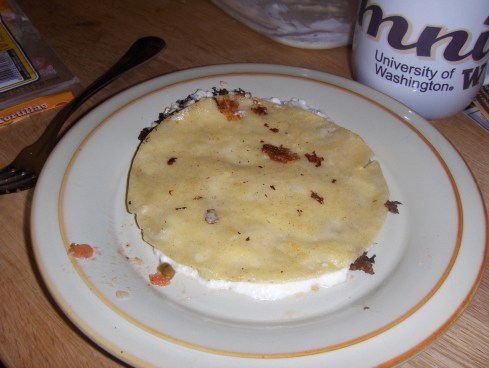 For dinner we took leftover enchilada filling (cottage cheese, mozzarella, and sour cream) put it between two corn tortillas with some pepper-jack cheese and fried it. Basically a very fancy quesadilla, but we still named them “Travicitos,” after their creator.