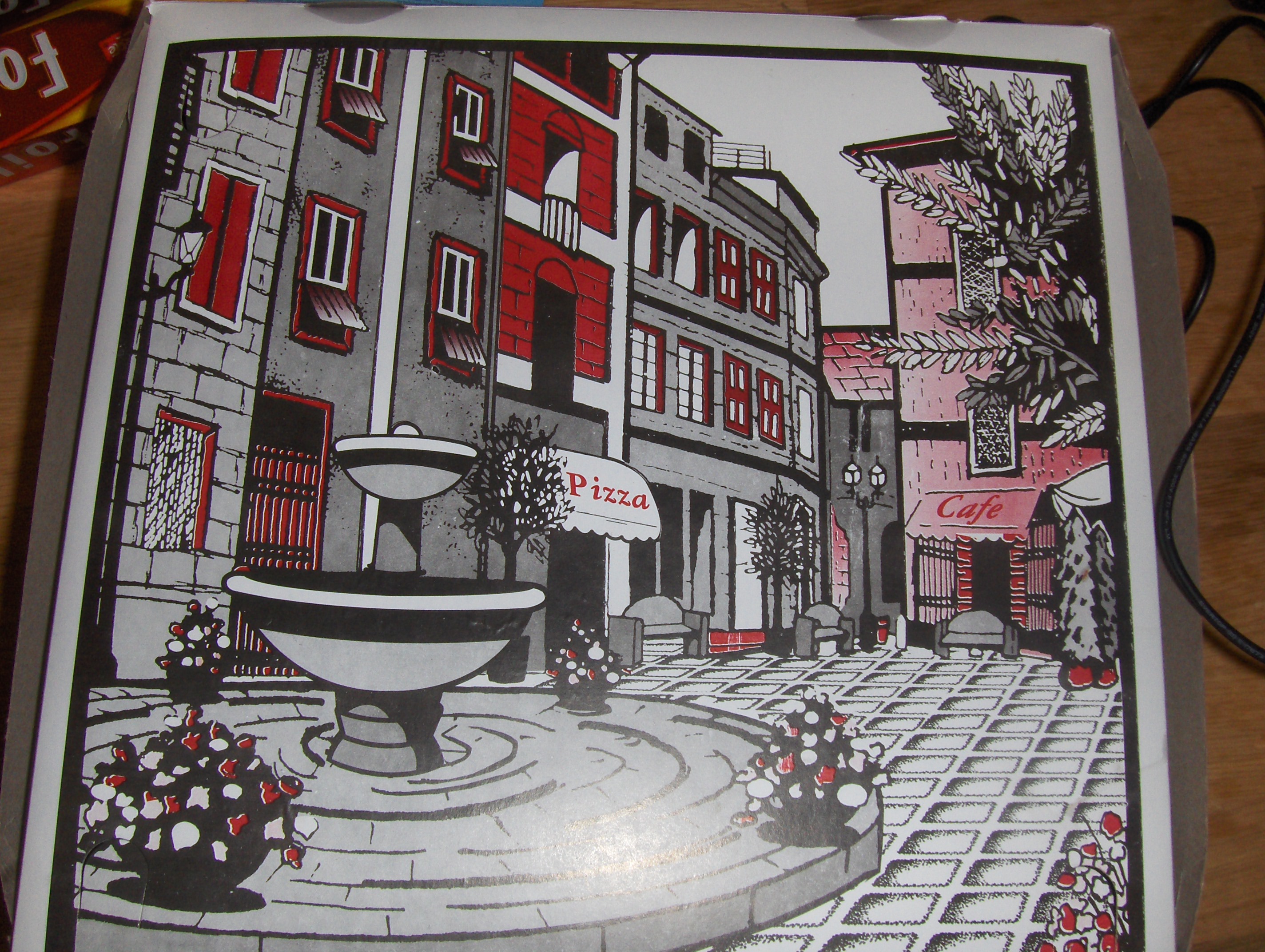 I was in that limbo of half-asleep when I realized I hadn’t taken a picture. I hate taking last minute pictures. I mean I’ve been so good about not doing that lately! Alas, here is the cheesy (no pun intended) pizza box that was sitting on my counter waiting to be recycled.