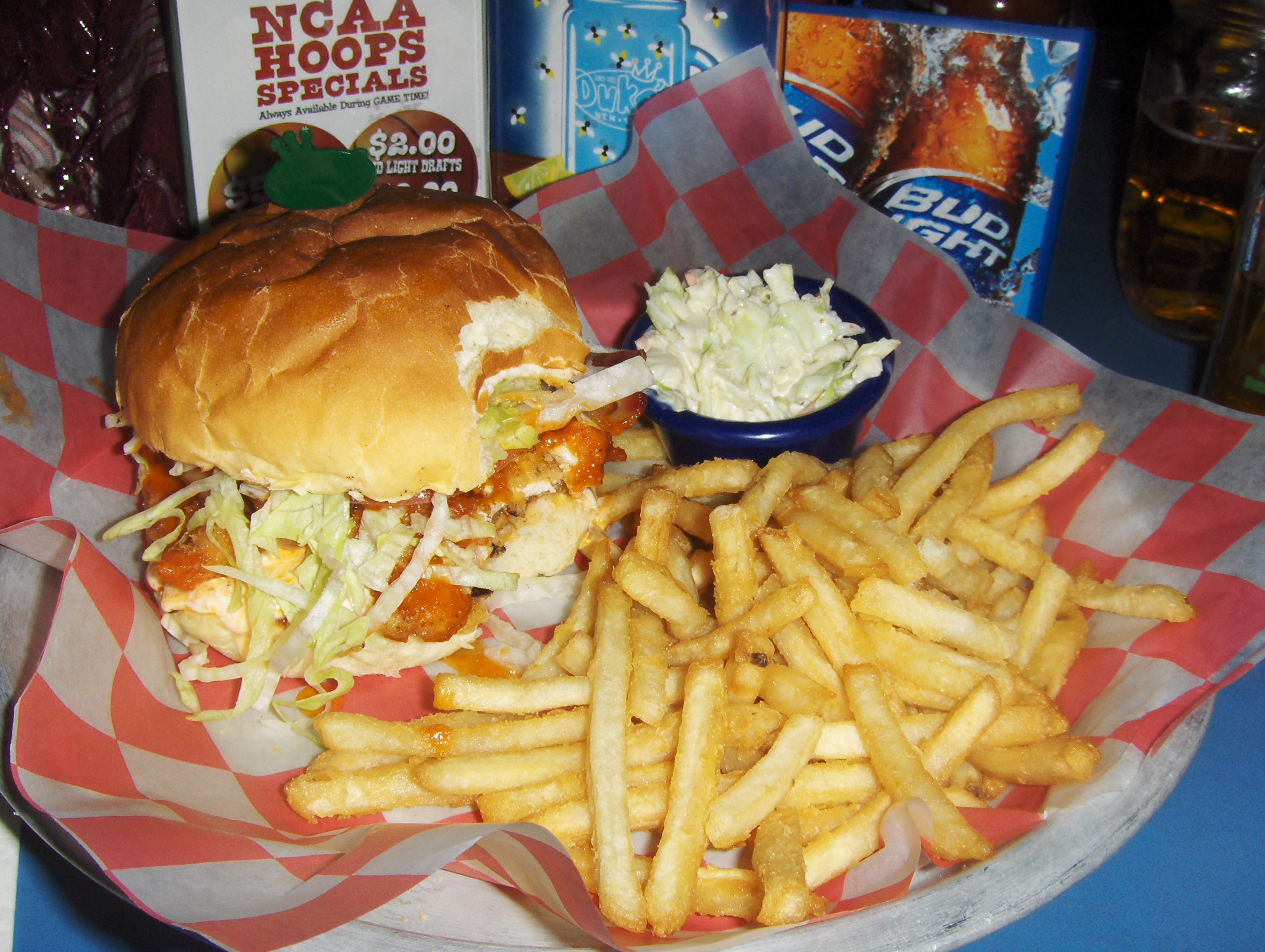 This was the end of a looong day. One of the craziest days I’ve had in recent memory. Up was down, black was white. Travis and I went to a place in Midtown ordered a pitcher of beer and some not-for-beginners food. I got the deep-fried Buffalo chicken sandwich with fries. For dessert, a cookie with ice cream and whipped cream on top.