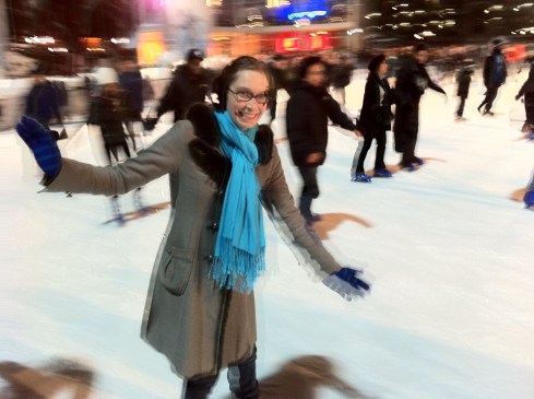 We went ice skating at Bryant Park. The iphone doesn’t handle motions picture very well, hence the creepy blacked out portions of my face.