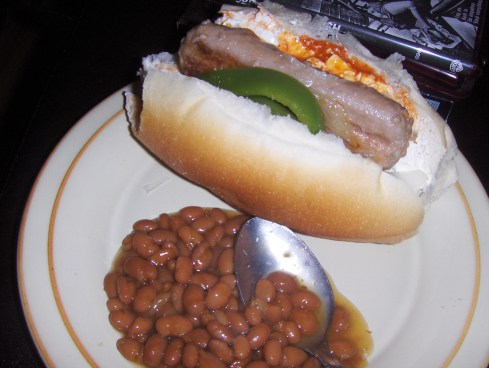 I had some left over sausage from a Tomato Vodka Sauce I had made a couple of nights earlier. So I attempted to recreate my favorite hot dog, the Seattle dog. I consider myself a hot dog connoisseur. I’ve had them all over the world, baby. But nothing to me is better than the way they serve them in Seattle. First they slather the bun in cream cheese, then they add the dog, and some grilled green pepper and onion. I always add Frank’s hot sauce to the cream cheese side of the bun. Voila! Seattle dog! I sauteed the pepper and onion and had to use Cholula hot sauce instead of Frank’s.