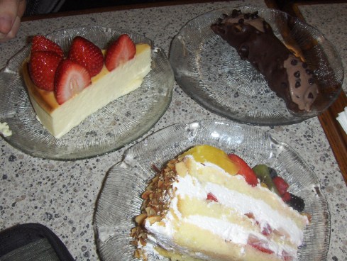 After a productive day, Travis and I went out for dinner. We went to a Mexican place called La Palapa in the East Village. The food was delicious, but it just didn’t match up to the likes of Bertha Miranda’s  in Reno. East coasters just don’t know how to do the Mexican food right. Our dishes cost twice what they would have in Reno, and we didn’t get the unlimited chips and salsa we had become so accustomed to. Not to mention no side of beans or rice! We left the restaurant still hungry. We headed over to a bakery called Veneiro’s. We ordered a cannoli, cheesecake, and the fruit supreme cake. Travis also wrote a new theme song for the two of us. It consisted of him singing in a falsetto “Two fat kids, three desserts.” They were fantastic! We weren’t even able to finish them all. The cannoli is still waiting in our fridge.