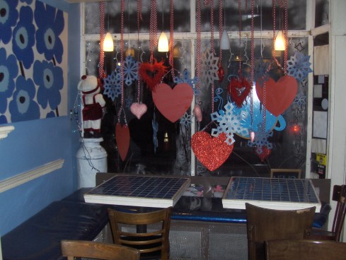 Our wild and crazy Friday night. We lounged around the apartment, until we decided to go hunt down a place called Milk and Cookies. Their website said they would be open until 11. We got there at 10:30 to find a locked door and different hours listed on the door. It said they closed at 10! We were so sad until the gentleman at the counter let us in to “warm up.” He ended up giving us a box of cookies. We had a coupon for a baker’s dozen, but he gave us more than that. This was the hasty picture I took of their window display. We took our cookies to a nearby Starbucks. It was our only option other than a bar, sadly. We both ordered milk and ate some of our cookies, like the old people we are.