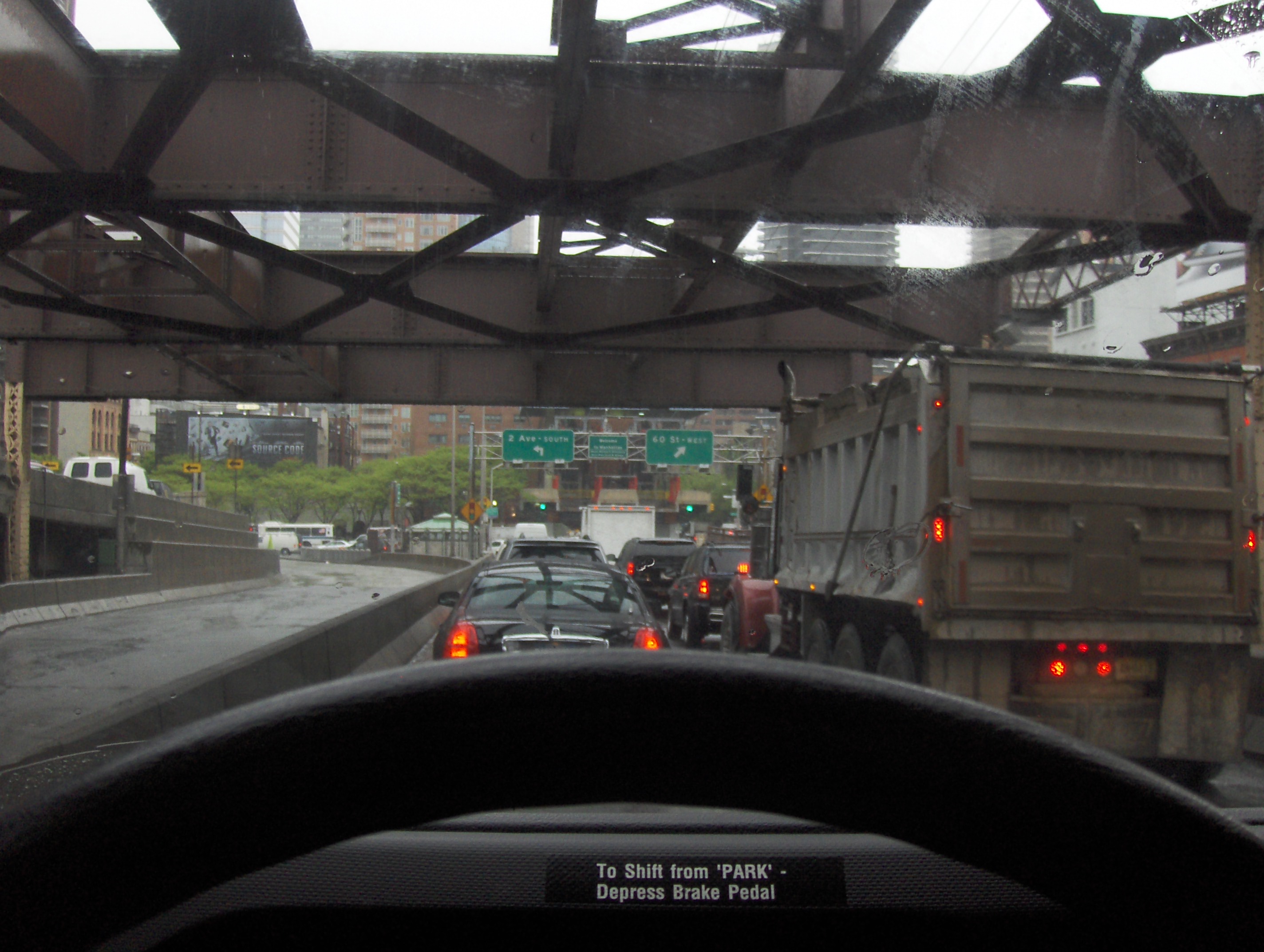 This is the nervous picture I took driving across Queens Bridge into Manhattan. My new roommate, Kier, had rented a U-Haul truck, but unfortunately, they wouldn’t let him drive it since he only has an Australian driver’s license and a Korean one. (He’s a very interesting guy!) So I agreed to drive it for him in exchange for “breakfast,” which turned out to be coffee and a pseudo Egg McMuffin from Dunkin Donuts, but I know the guy is broke so I took it very graciously. Plus driving a U-Haul in Manhattan is kind of fun. I like driving. I don’t really miss having a car and all the expenses that go along with it, but I miss driving around. I had work at 10, and we had to return the U-Haul before 9. I believe we got up at 6. Actually I got up at 6. He returned from his other apartment at 6 to meet me. He hadn’t slept in two days! Kier passed out in the seat next to me, and I happily listened to NPR while driving through the downpour.