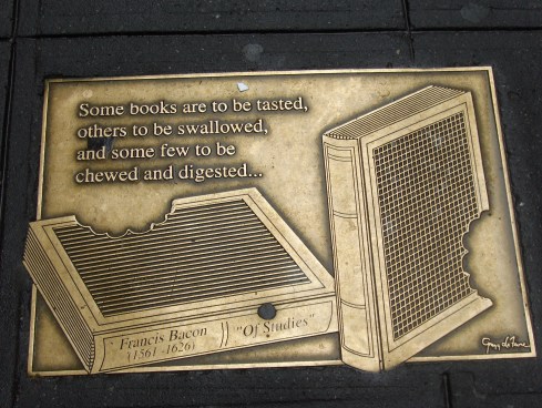 I like to own books so that I can do with them what I will. But that is a luxury that I had to temporarily forgo. I have been devouring books lately, though and desperately needed a library card. I went to the central Manhattan branch which is pretty much the only one open on Sundays. I walked down Library Way where all these placards are embedded in the street.