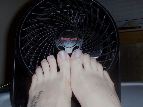 It got hot. Fast! I’m not complaining, because I know it is going to get much worse before the summer is over. In all honesty, I’ve enjoyed the weather of late. It has been sunny. I haven’t had to wear a jacket. I can read outdoors. All good things. This day was pretty hot and sticky though. I came home from work and did this for a long time, put my pedicured toes in front of the fan, a wet towel on my legs, read, and wrote. I also had a tall glass of ice water by my side. All in all, not a bad way to spend an evening.