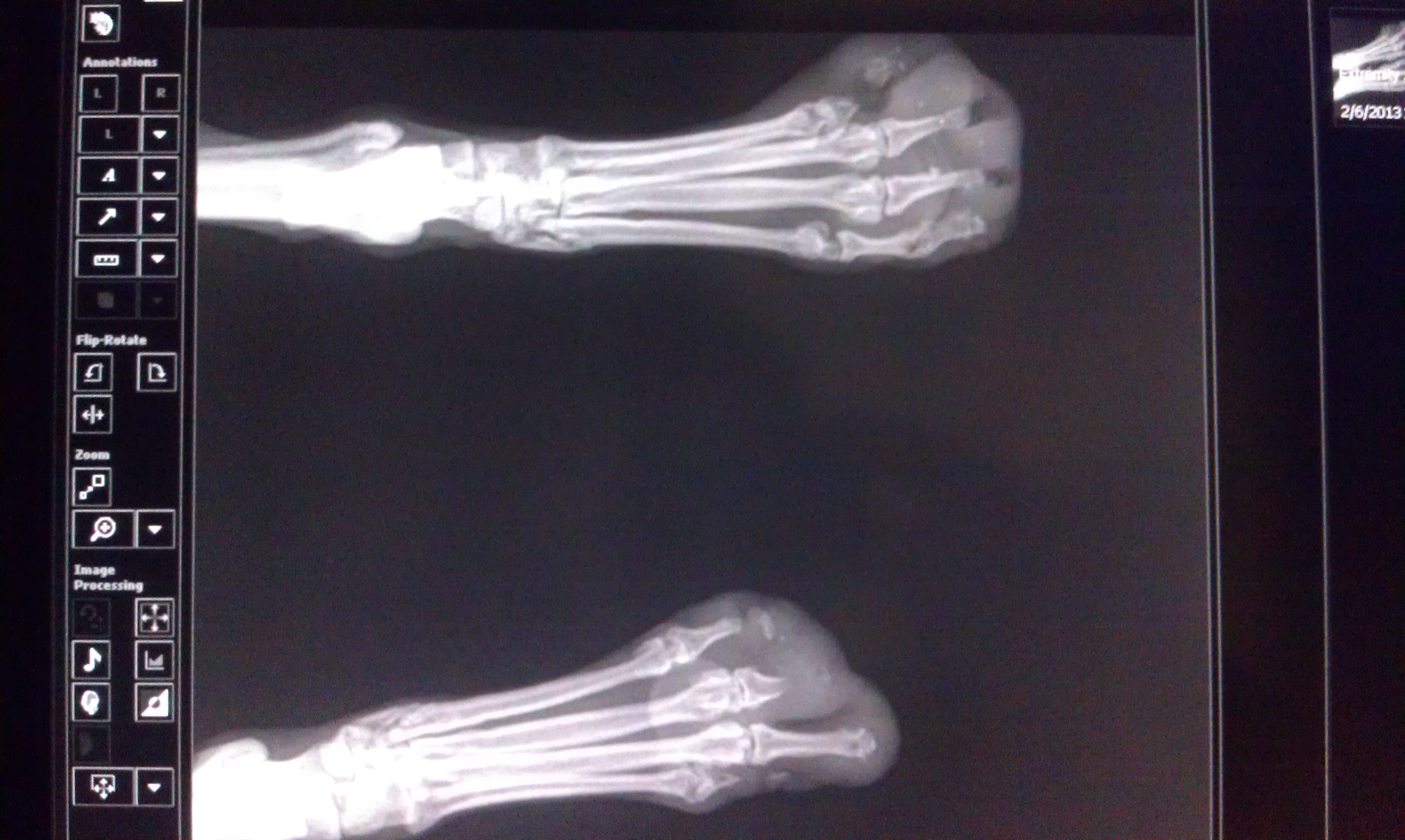 Radiographs of her back paws, with distal bones missing.
