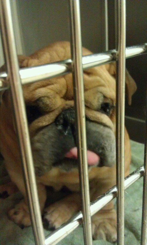 I took this picture of Raja, because it is the happiest I’ve ever seen her. I often refer to her as “My Cranky Darling.” She has horrible allergies which cause her to have scabby pustules on her body and horrible, goopy discharge from her eyes. She is also VERY protective of her owner. Whenever I go into the room, she growls and snarls at me. Her owner and I laugh a little as she hands me the leash. Raja trots along behind me, willing to walk, but growling with displeasure. Once we are in the treatment area and away from the owner, she is a sweet, loving dog. This was after Dr. N changed up her treatments and recommended special grooming. I think it’s her sass and chubby waddle that stole my heart.