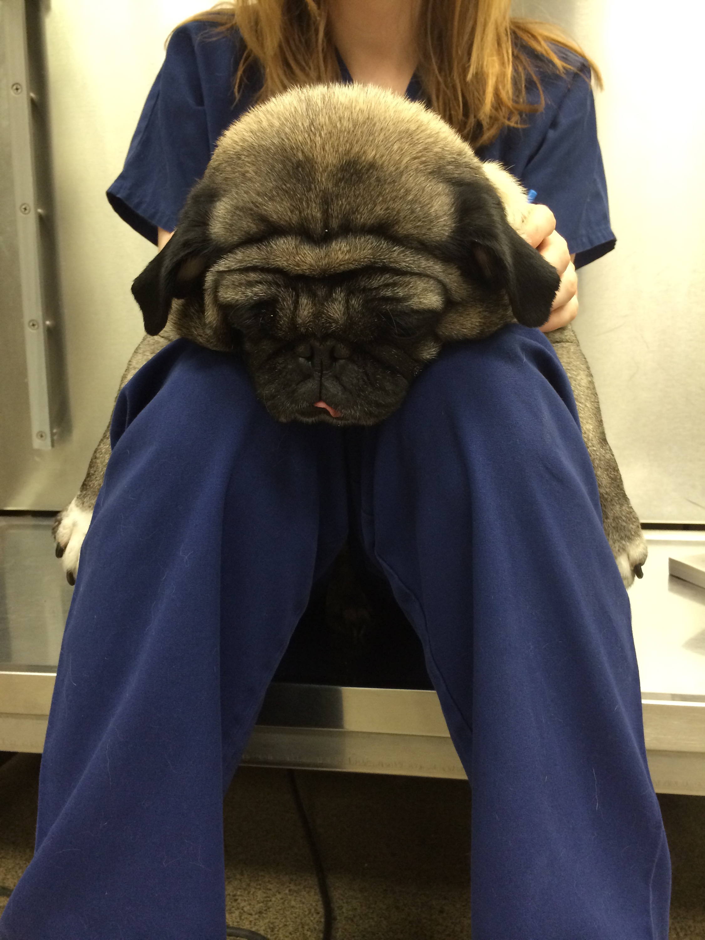 My darling Princess. One of the owners of the clinic, Dr. S, has a special affinity to pugs. We work with a pug rescue organization and have become known as the premier pug veterinary hospital in New York. Therefore pugs have a special place in my heart. Ellie Mae is one of the greatest pugs, and for us, it was love at first sight. Those tiny black ears, her feminine cankles, the grey fur on her chest. She has back issues and walks with an odd little strut that drags her back legs. I think she is perfection. I’ve become friendly with her owner and take care of her when she’s out of town. And despite the fact that she pooped on me once when I was putting booties on her feet before we walked in a blizzard, she’s still a special, special dog to me.