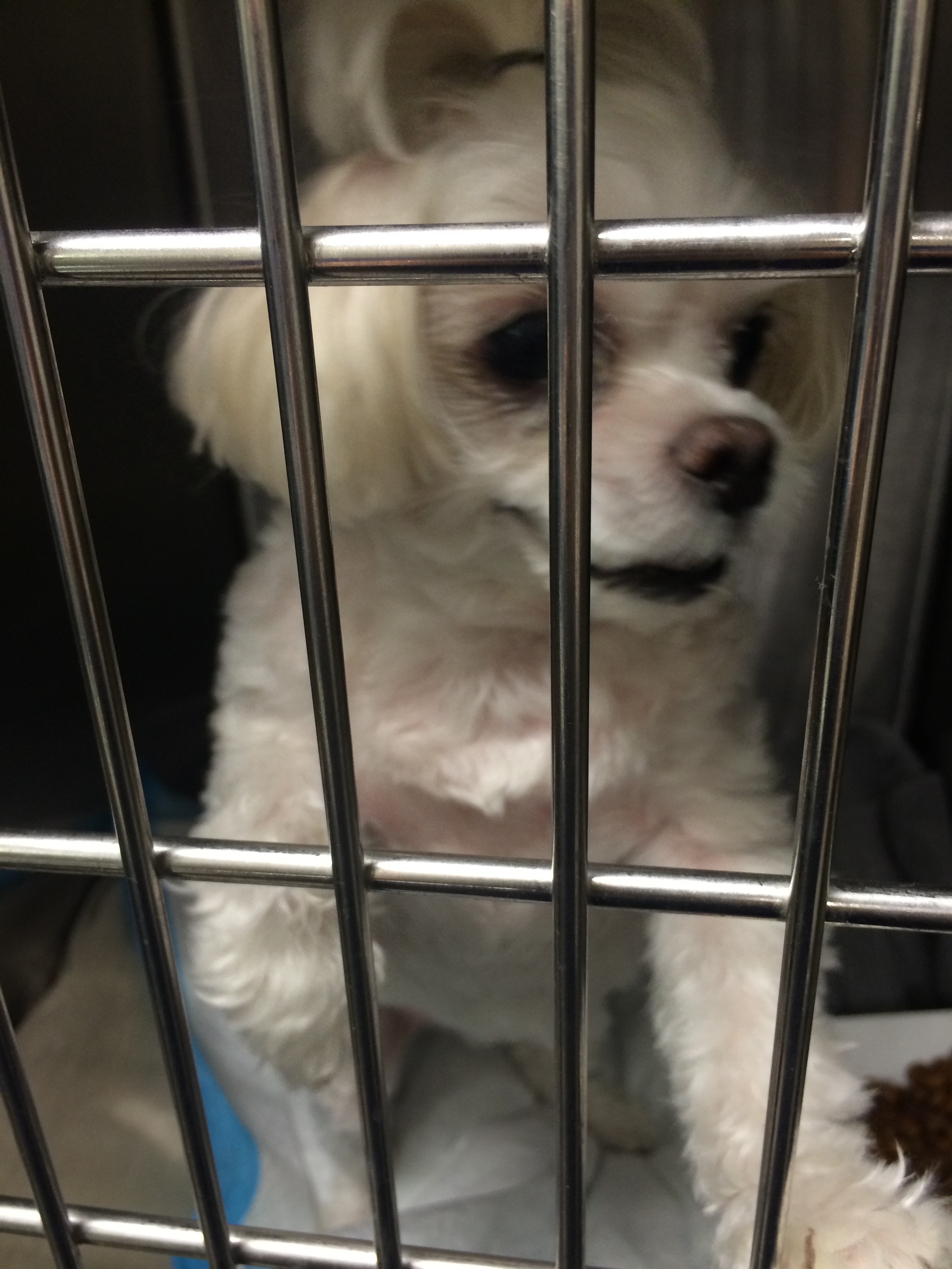Raffee is a classic rags to riches tale. His owner was summering in Florida when she saw Raffee alone and running around on a tennis court. Once she was back in New York with him, he seemed off to her, so she brought him in. During the routine exam, I noticed he felt cold. We took his temperature, and it was something in the 93, 94 range. A dog’s normal temperature is 101.5, so something was very wrong. We ran bloods, and Dr. L racked her brain trying to figure out what was going on. I did all a technician could do. I heated up some water bottles and plugged in an electric blanket. I bundled him up with the warming aids and held him close to me. With that temperature, he was only a couple of hours away from dying. He kept staring into my eyes, and it was the first time as a technician where I could sense the gratitude of a patient. Dr L figured out that he has Addison’s Disease which is a manageable adrenal disease. Within a couple of days, he was fixed. He’s so very special to me, because I’m convinced that he remembers me from that time. When he comes in for his steroid shot (that’s why he’s so fat), he runs straight to me , tail wagging. He’s a perfect example of why I love my job and why it feels good to do what I do.