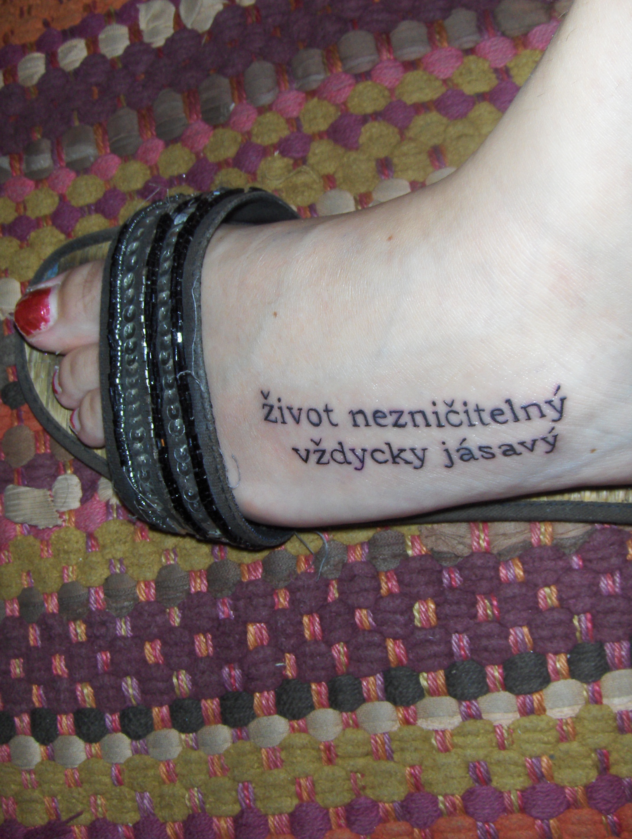 “It means ‘life indestructible, always triumphant.'” “It’s in Czech.” “It’s from a book I read while I was there.” “Yes, I’m sure I know what it says.”
